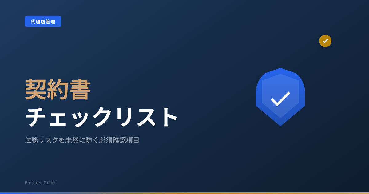 代理店契約書で必ず確認すべき15のチェックポイントを解説。独占性・手数料体系・競業禁止・解除条件など法務担当者とチャネル営業担当者が知っておくべき要点をまとめました。