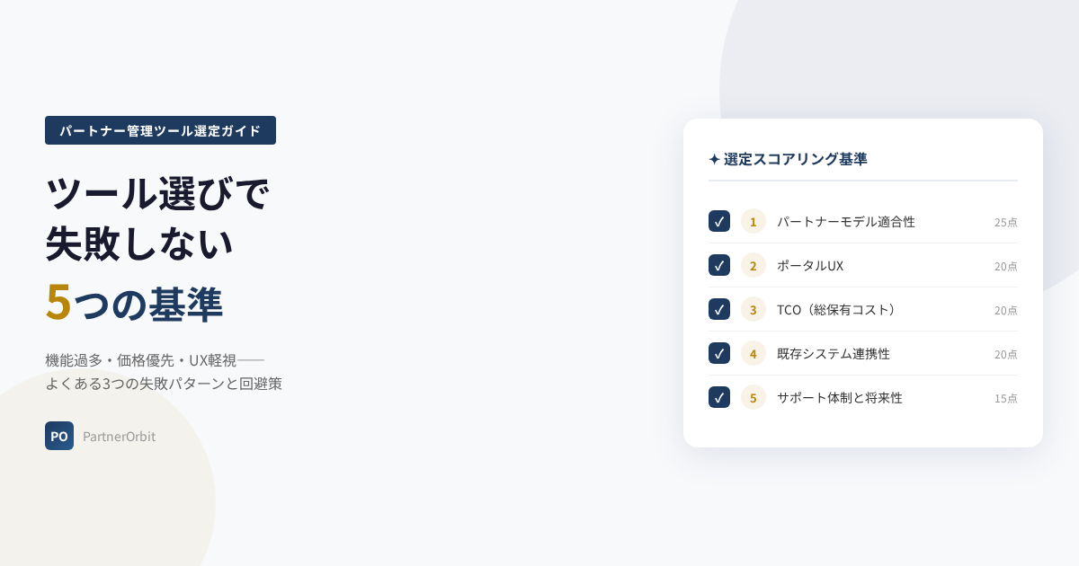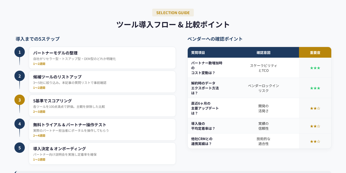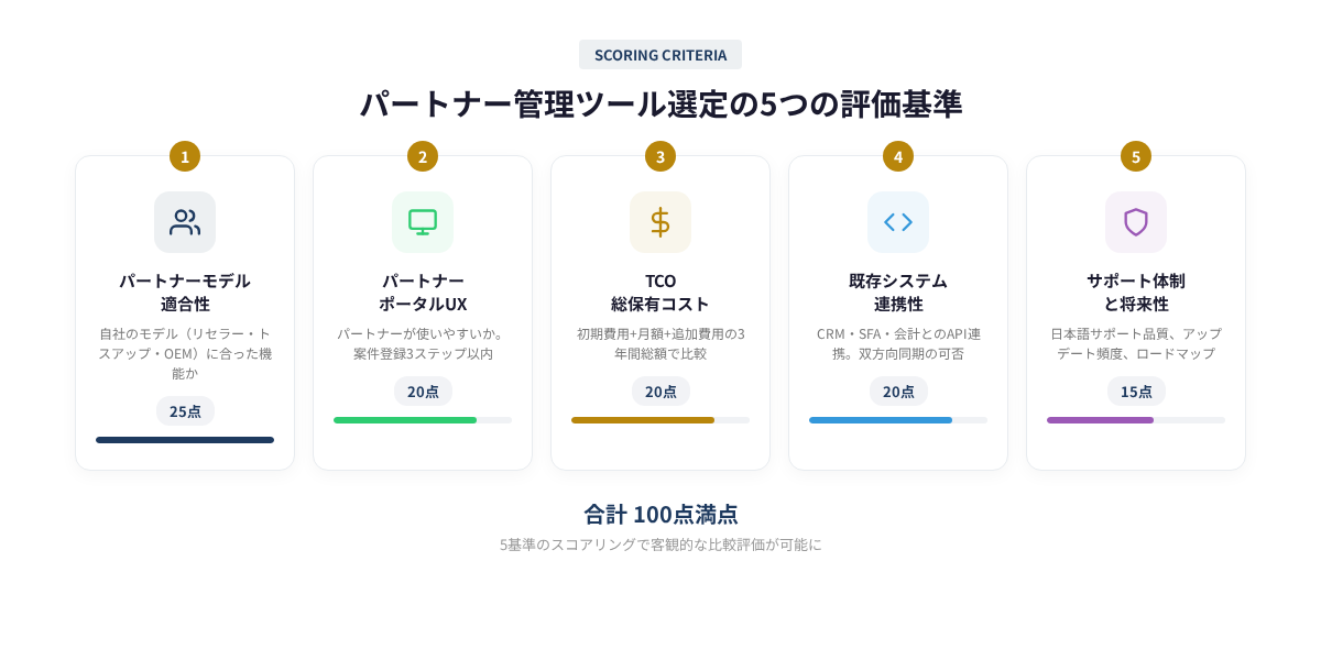 パートナー管理ツールの選定は、適合性・UX・TCO・連携性・サポートの5基準でスコアリングすることで、感覚的な判断を排除できる。特に「パートナーポータルのUX」は見落とされがちだが、ツールの成否を決定する最重要因子だ。