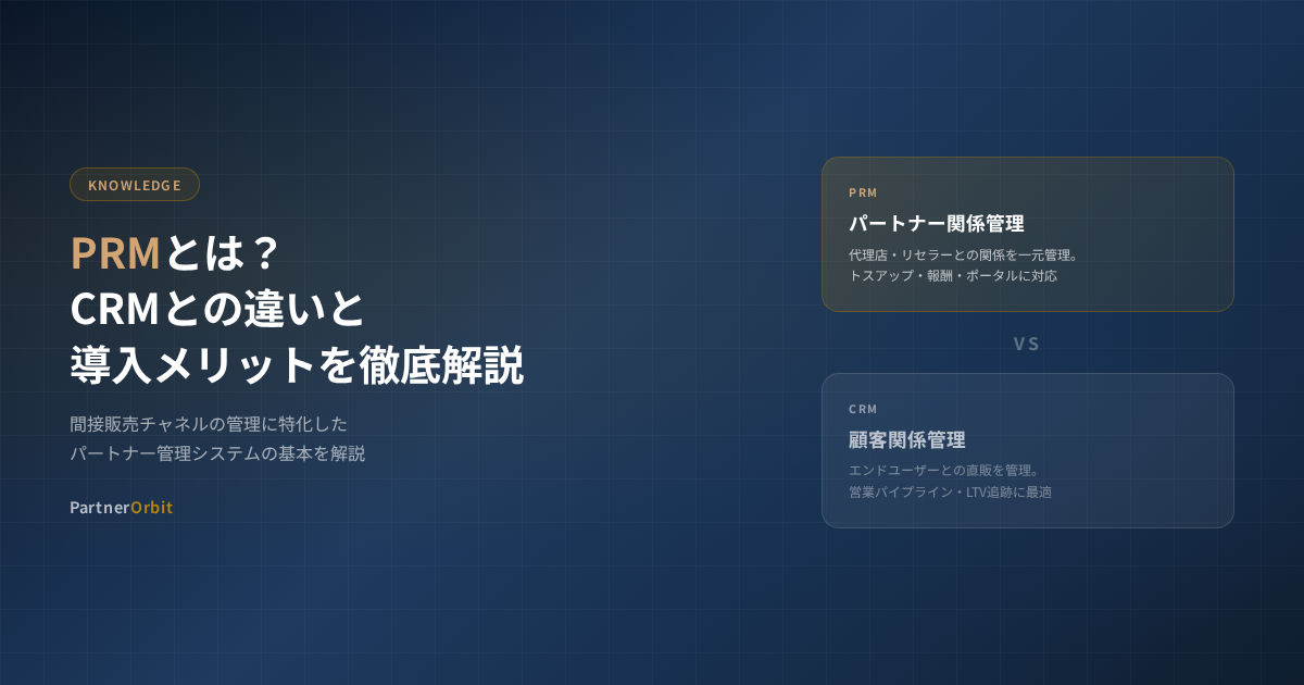 PRMは、代理店・パートナーチャネルを持つ企業が間接販売の成果を最大化するための専用ツールだ。CRMが直販の顧客管理に特化する一方、PRMは間接販売のパートナー管理に特化しており、管理対象・データの流れ・必要な機能が根本的に異なる。