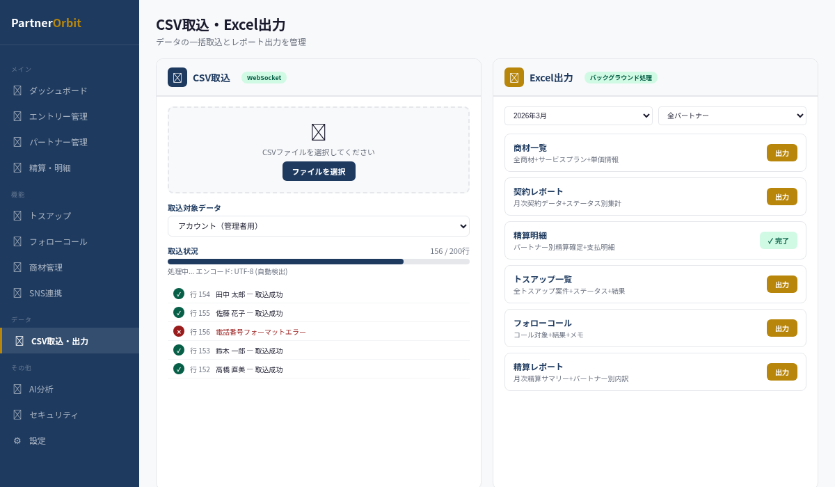 CSV取込の進捗をWebSocket経由で行ごとにストリーミング表示。成功・エラーが即座に分かり、エラー行の内容も詳細に確認できます。文字エンコードも自動検出で手間いらず