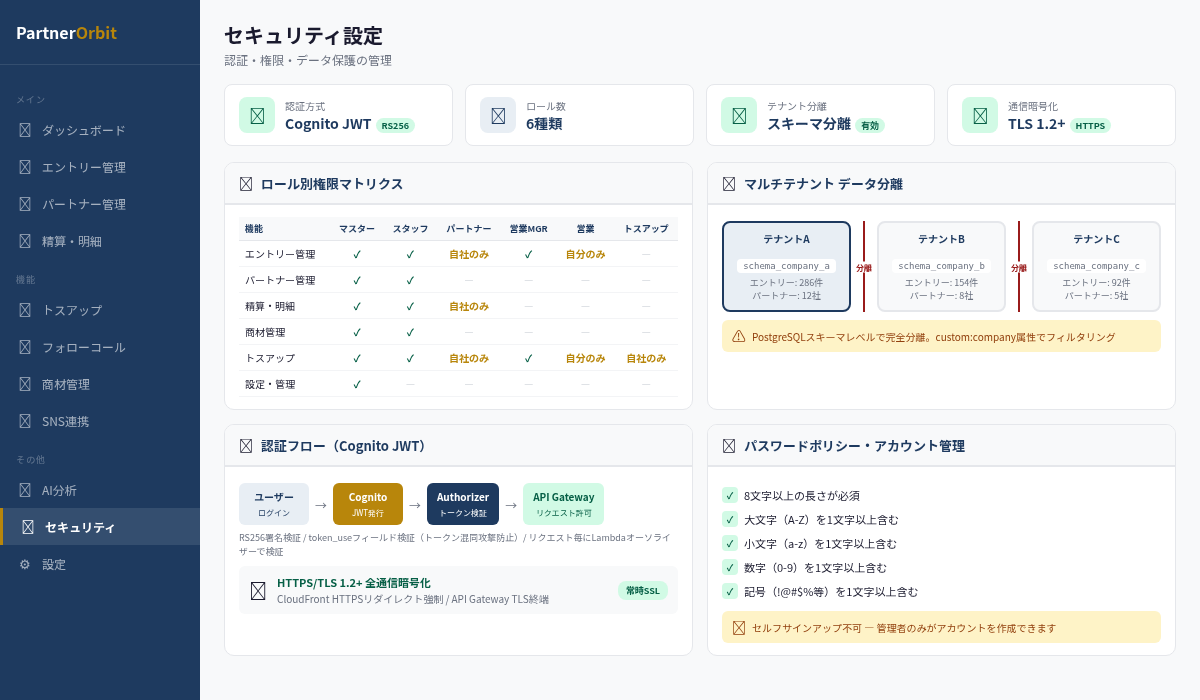- ✓テナントごとにデータベースを完全分離(PostgreSQLスキーマ分離)。構造レベルで他社データが見えない設計