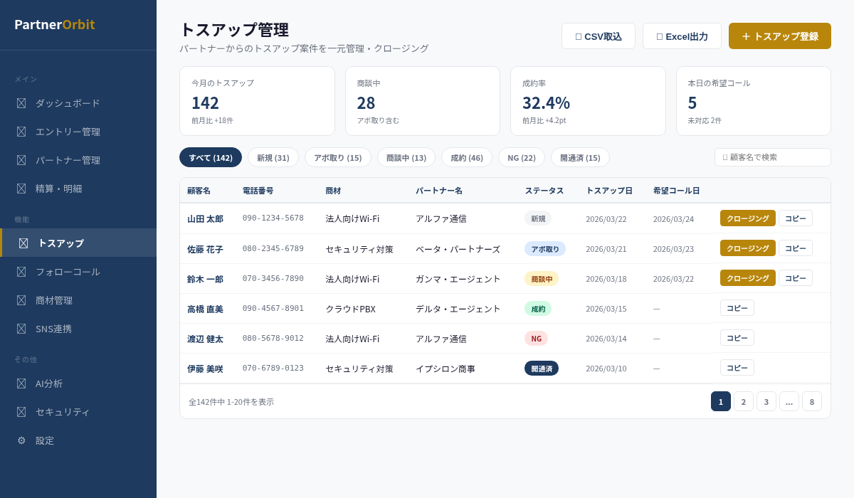 パートナー別・商材別・期間別・ステータス別・担当者別の5軸でトスアップ実績を分析。成約率の高いパートナー・商材の組み合わせを発見できます